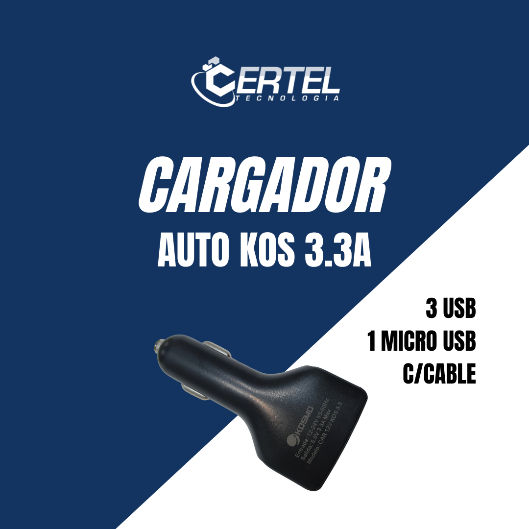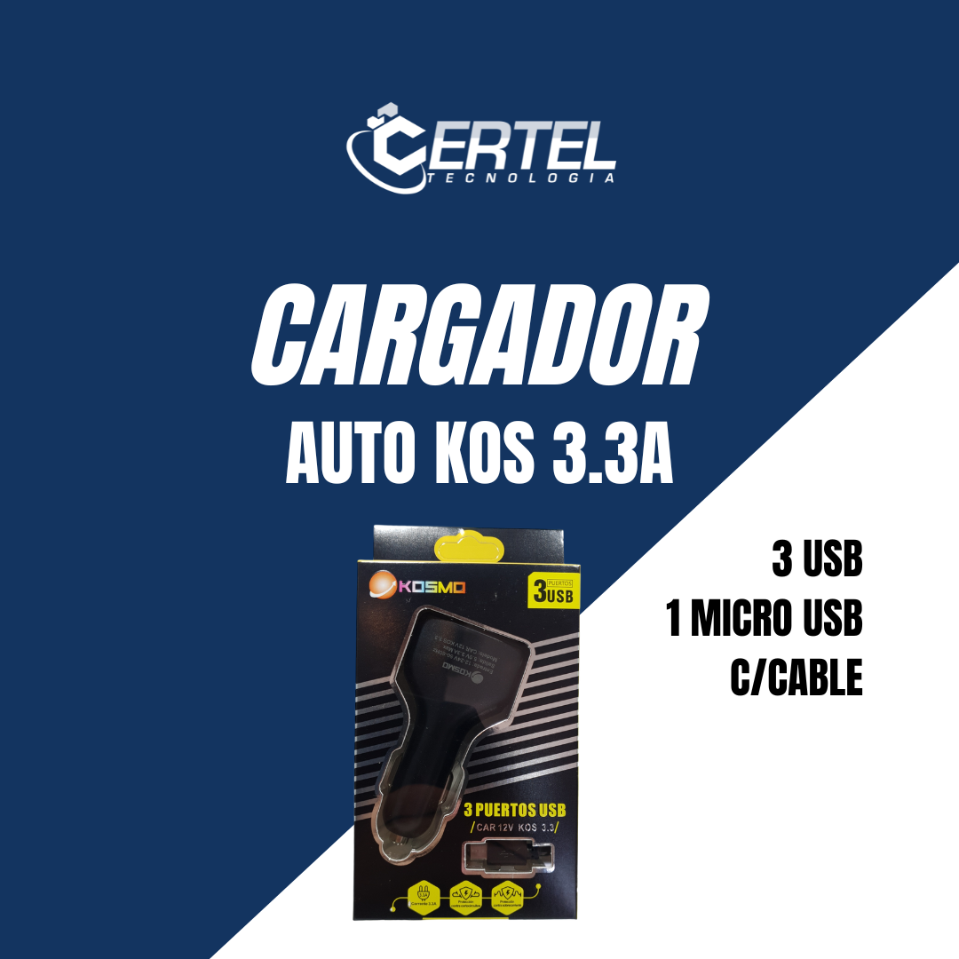 Cargador de Celular Kosmo para Auto de 3.3A de 3 Puertos+ Cable Micro USB